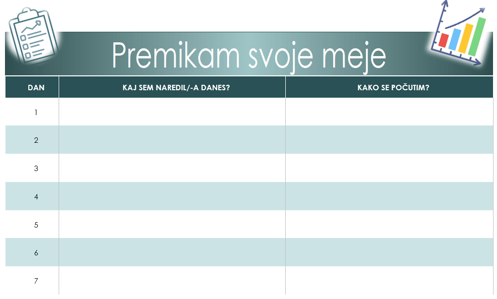 Ustvari si mini sledenje napredku. Lahko slediš v zvezku, v beležki na telefonu ali z uporabo spodnje tabele.